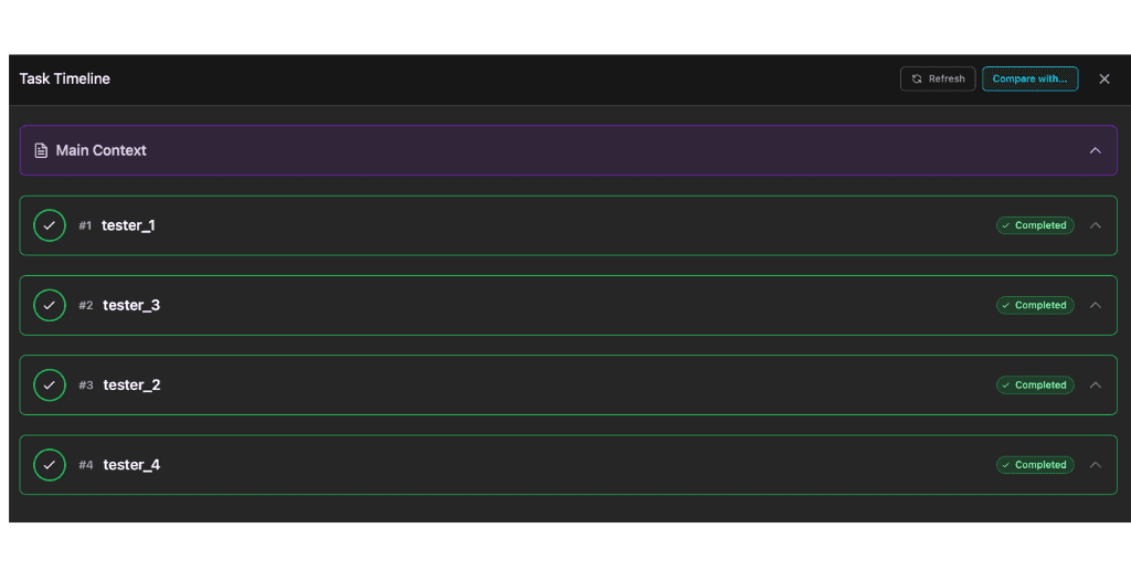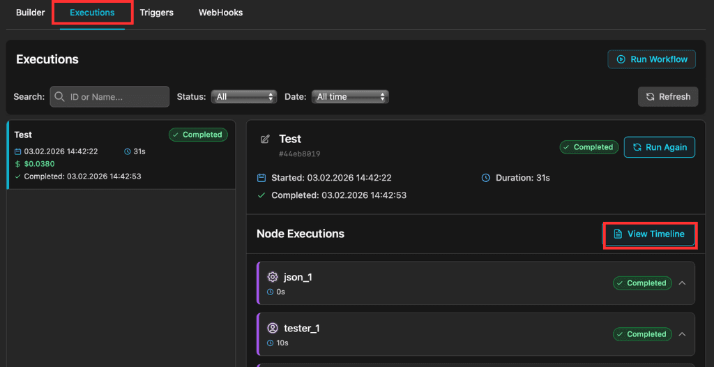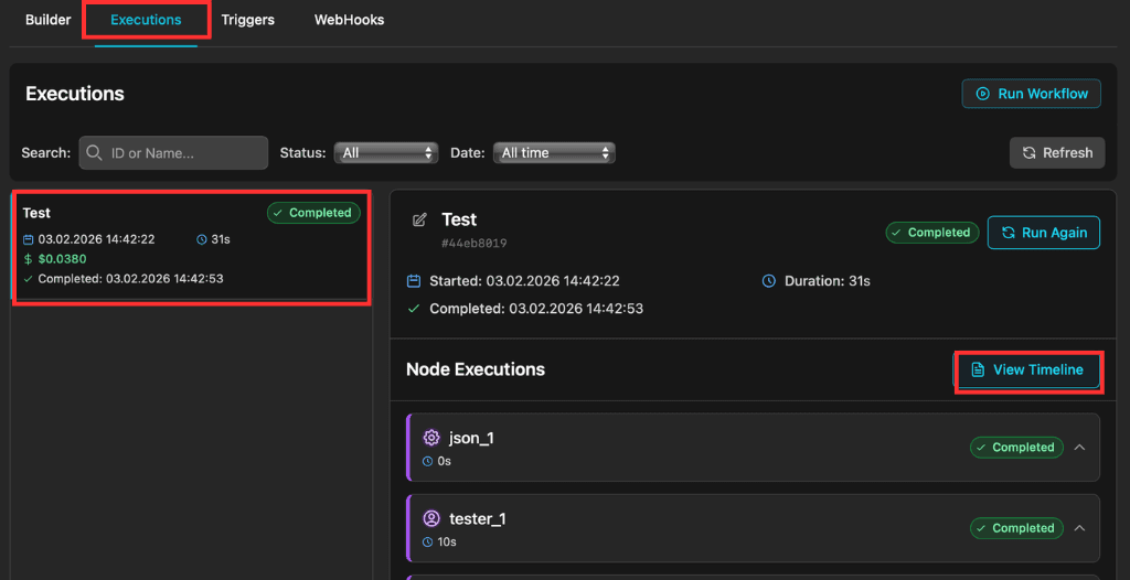 Po otevření timeline uvidíte detailní průběh a výsledky vašeho workflow, včetně jednotlivých kroků, jejich pořadí a výstupů.