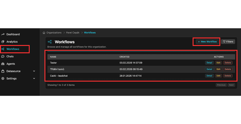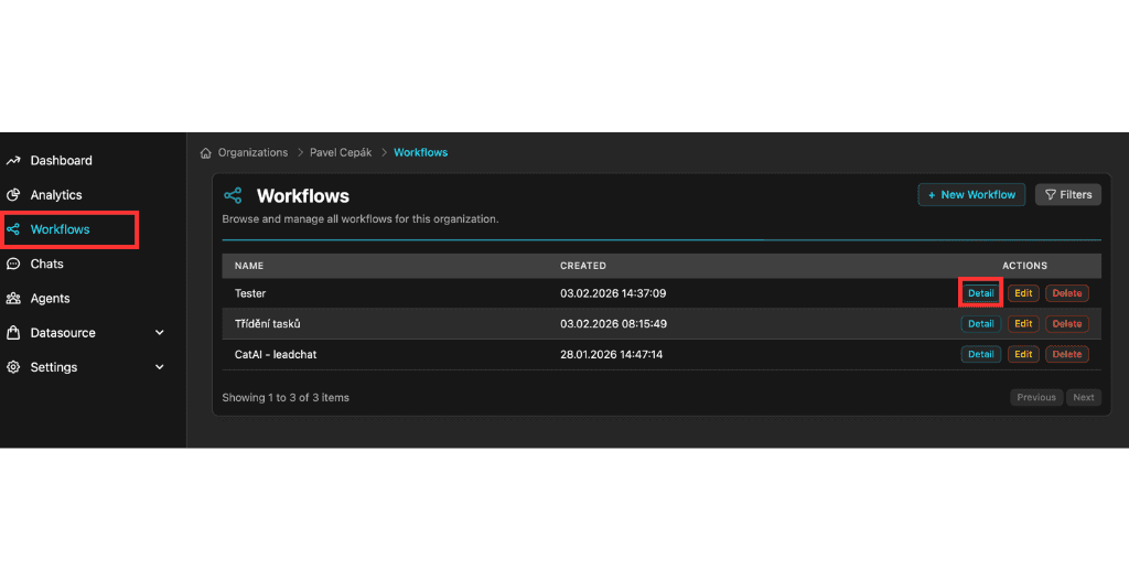 Pokud už máte workflow vytvořené, klikněte na detail konkrétního workflow.